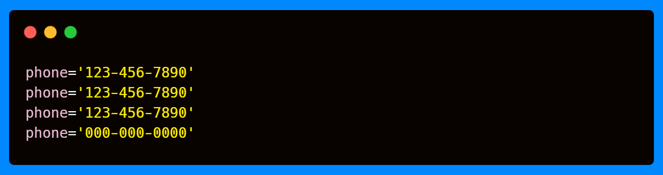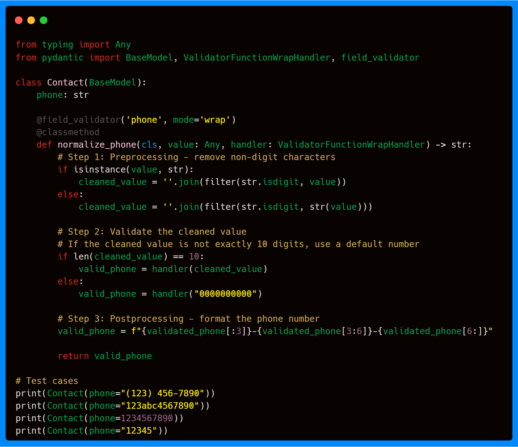 The code above shows that the normalize_phone validator performs three main steps. First, it cleans the input by removing any non-digit characters, ensuring a consistent format regardless of how the phone number is provided. Second, it checks the length of the cleaned number: if the length is correct, it passes the value through Pydantic’s built-in validation using a handler, which is a mandatory callable. If it’s not exactly 10 digits, a default number is returned. Finally, it formats the validated phone number in the standard XXX-XXX-XXXX format.