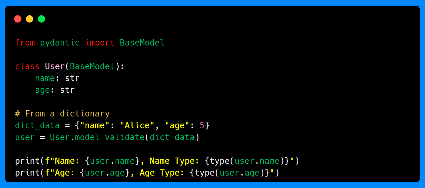 Here, even though the "age" value is a string in the input dictionary, Pydantic automatically coerces it into an integer. This method is especially useful when working with external systems that deliver all values as strings, making it easy to enforce type safety.