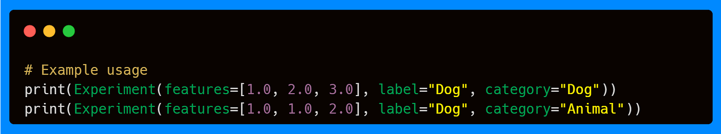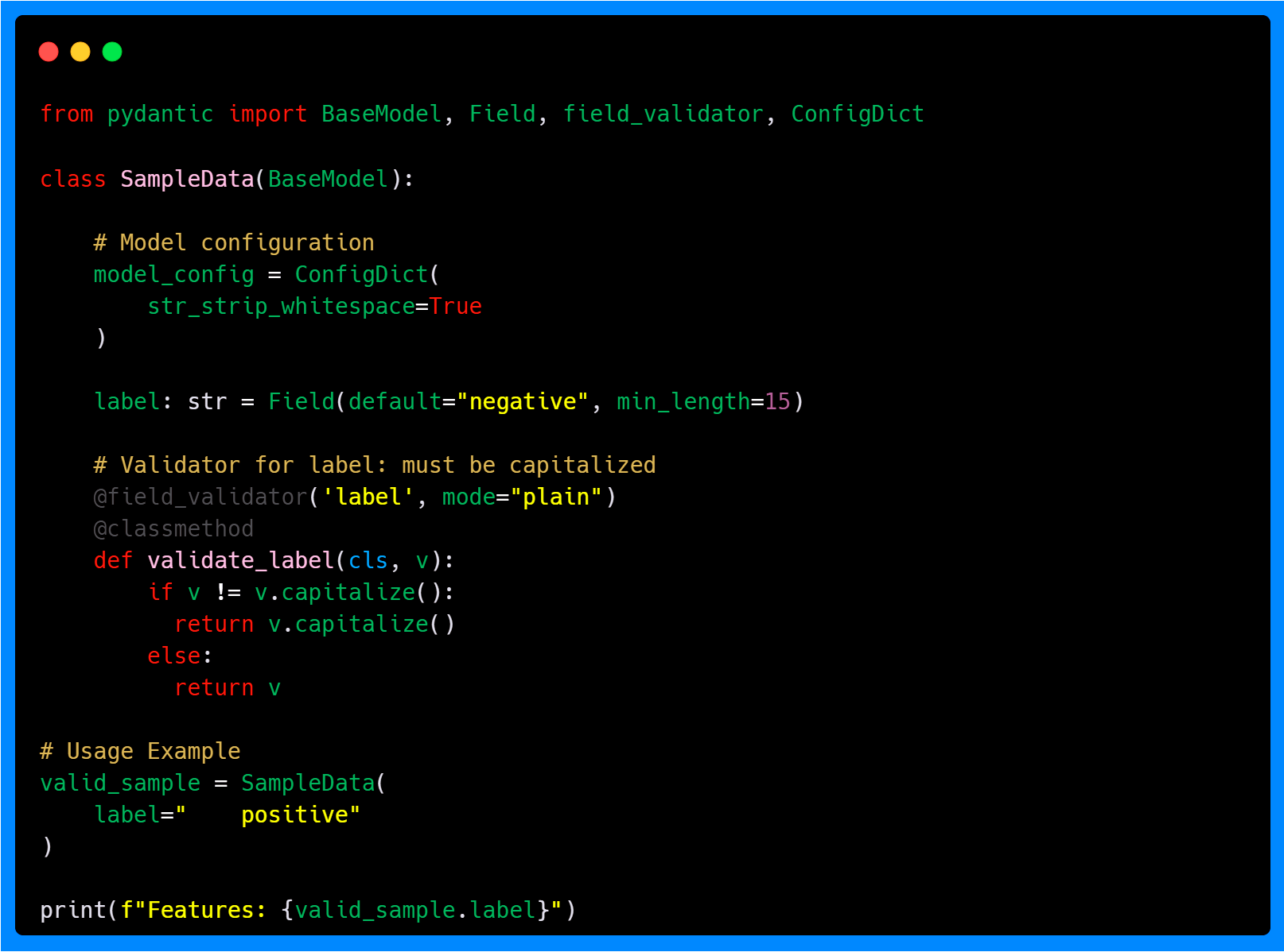 In this example, we are combining Pydantic’s built-in validation features (ConfigDict and Field), shown in the previous article, with field validators. The built-in options run first: ConfigDict automatically strips whitespace from all string fields, which reduces repetitive cleaning logic, while Field(max_length=10) ensures that the label contains a maximum of ten characters. After these internal checks, the custom field validators run to enforce rules that cannot be expressed with Field or ConfigDict alone.