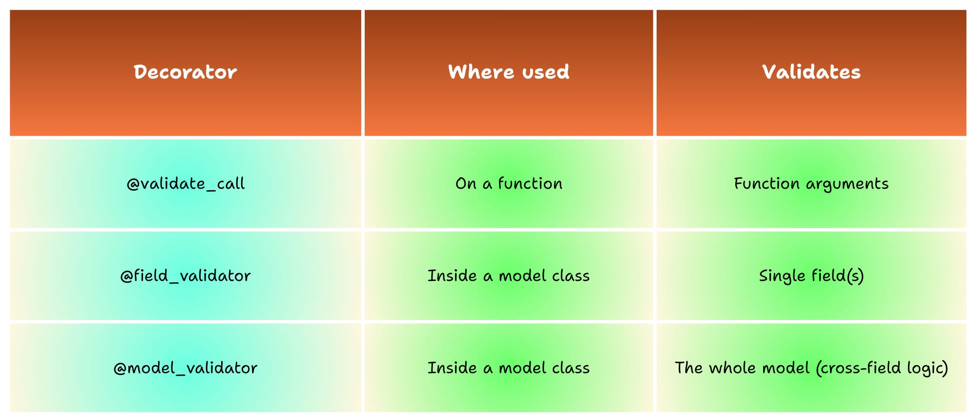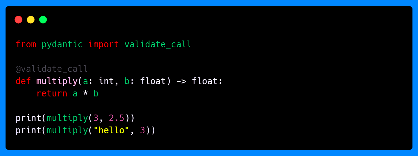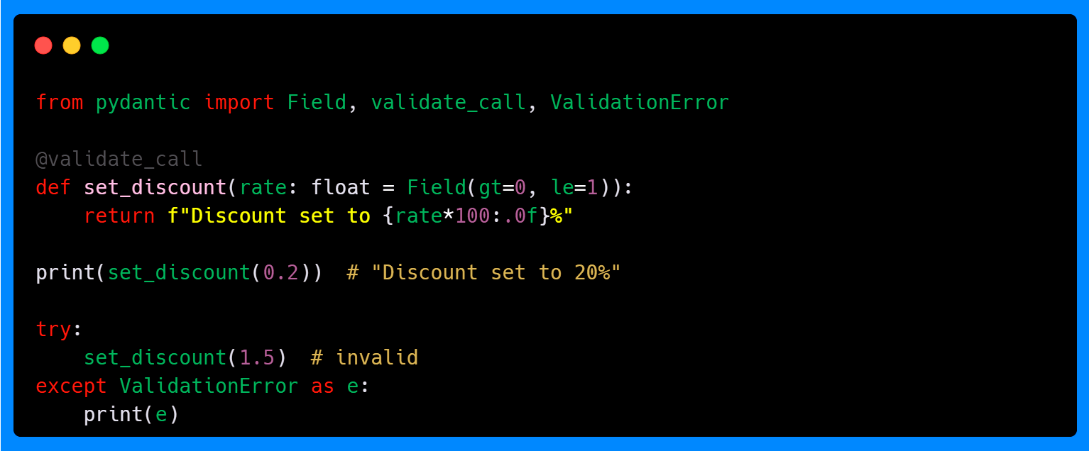 So far, we’ve worked with field- and model-level validation, but Pydantic also provides a way to enforce validation at the function level with @validate_call.