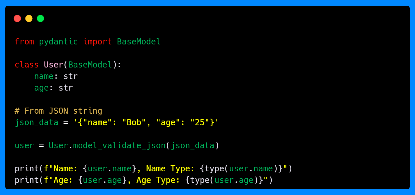 When working with APIs or stored configuration files, JSON is one of the most common data formats. Pydantic provides model_validate_json() to handle JSON strings or bytes directly, saving you the extra step of calling json.loads() yourself.