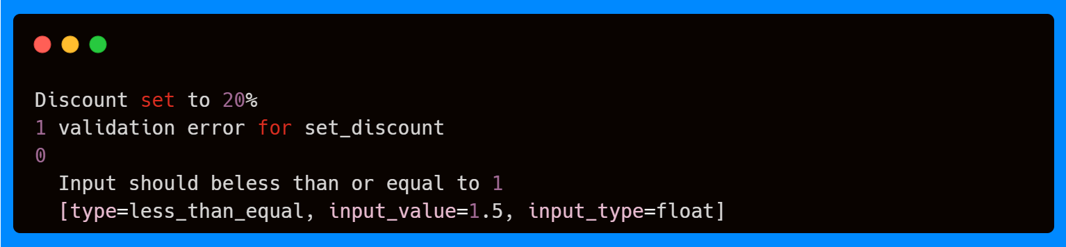 Note: Coercing a value, means it automatically converts compatible inputs into the expected type. For example, a string like "123" can be coerced into an integer 123, or "3.5" into a float 3.5. If conversion isn’t possible, Pydantic raises a ValidationError. In my next article I will cover how Pydantic manages coercion, as there are some in-built automatic coercions.