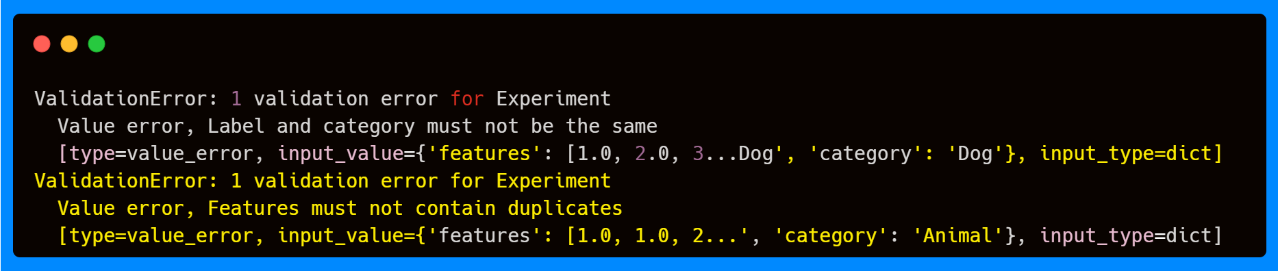 If you try to pass in invalid data (like duplicate features or identical labels and categories), the validator raises an error. Importantly, this happens after field-level validation—so if the features field has fewer than 3 elements, that error will surface first.
