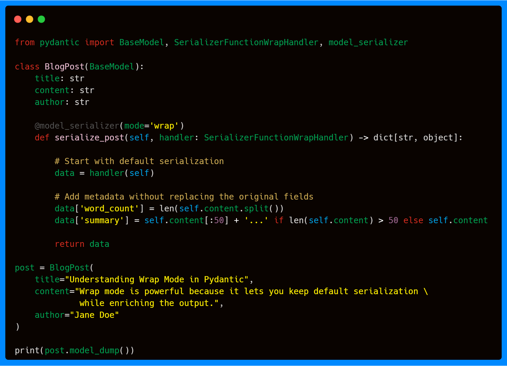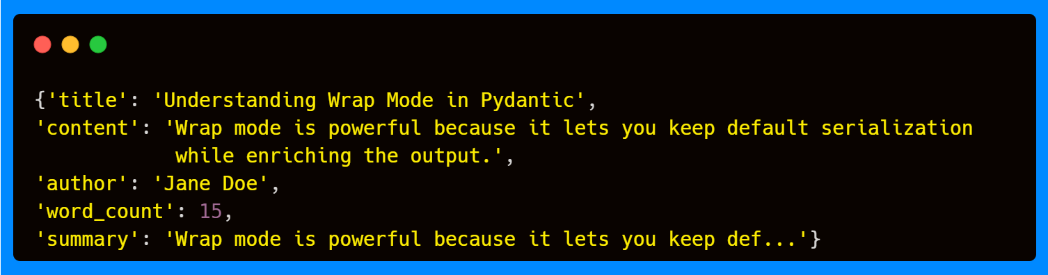 Here, the handler first delegates serialization to Pydantic, ensuring the base structure remains intact. We then extend the output with computed fields like word_count and summary. This makes wrap mode perfect for cases where you want to preserve consistency but also enrich your data with extra insights.