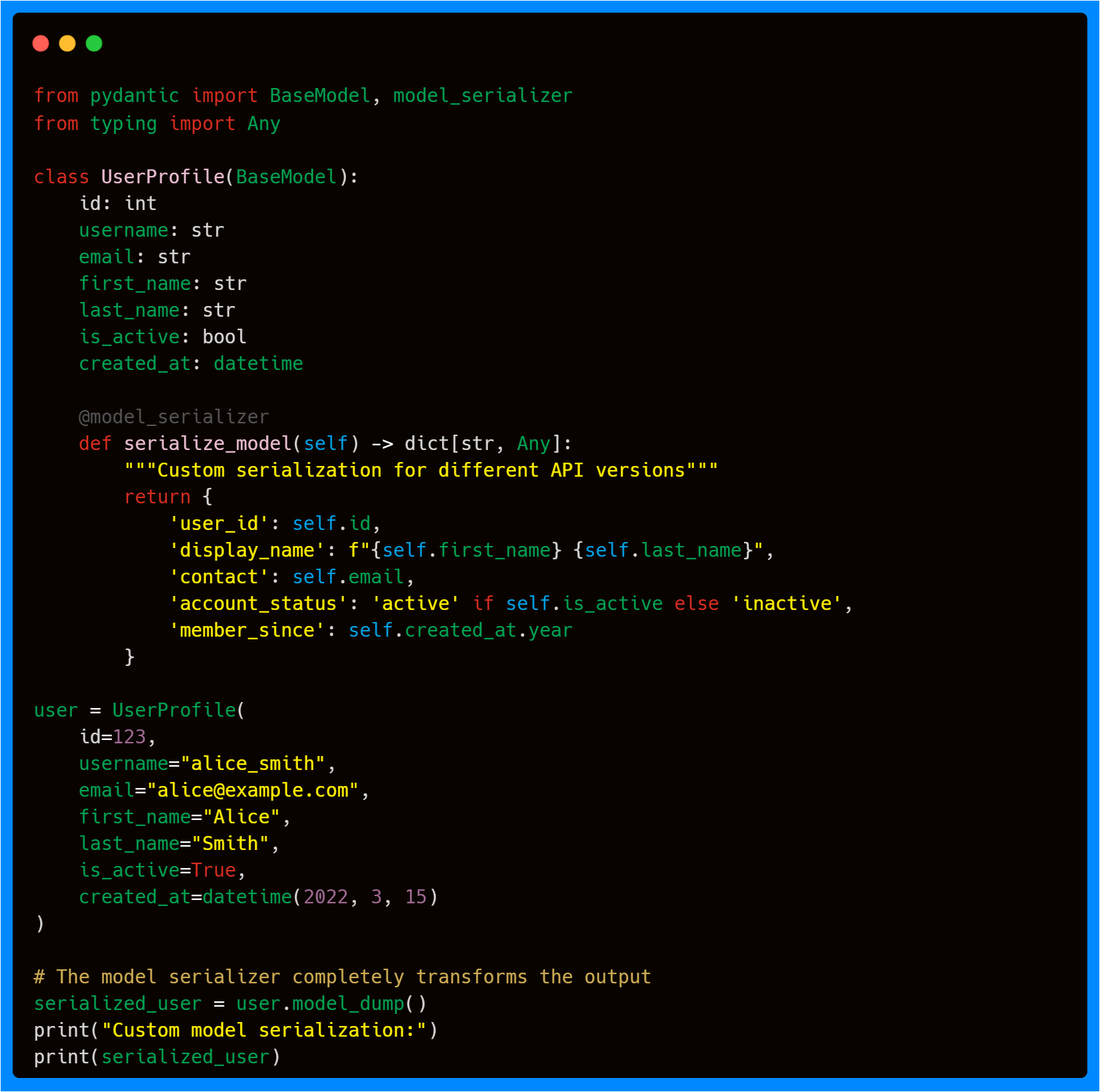 Beyond basic model dumping, Pydantic offers sophisticated serialization customization through various serializer types, similar to custom validators we saw in Part 2 of this article series. This is particularly valuable when working with external systems that expect specific formats or when you want to streamline how your models are exported.