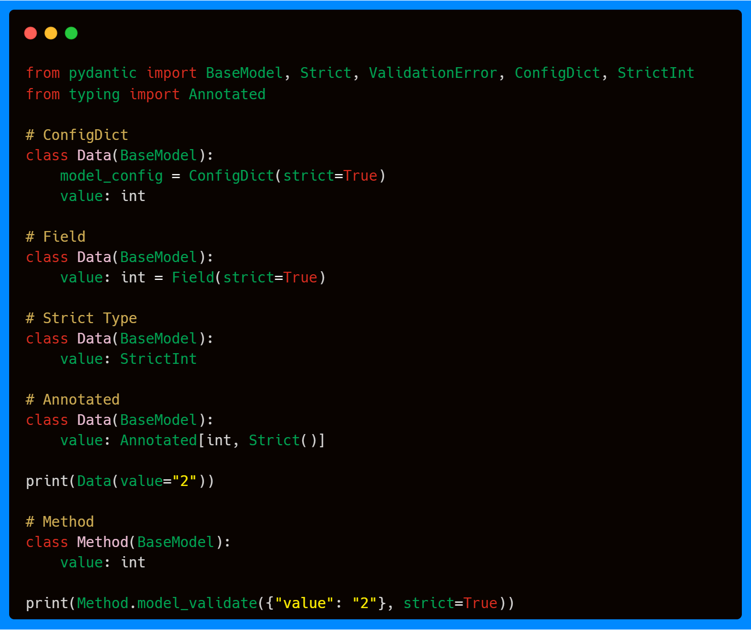 The strict mode can be handled in different ways. The most common one is by adding the parameter strict=True to the Field function, ConfigDict class, or validation methods, but you can also achieve strict enforcement by using the built-in Strict* types or wrapping a type with Annotated together with the Strict() class.