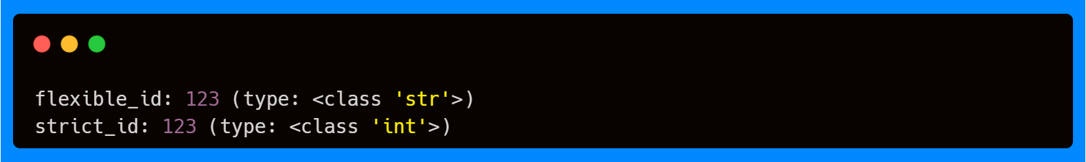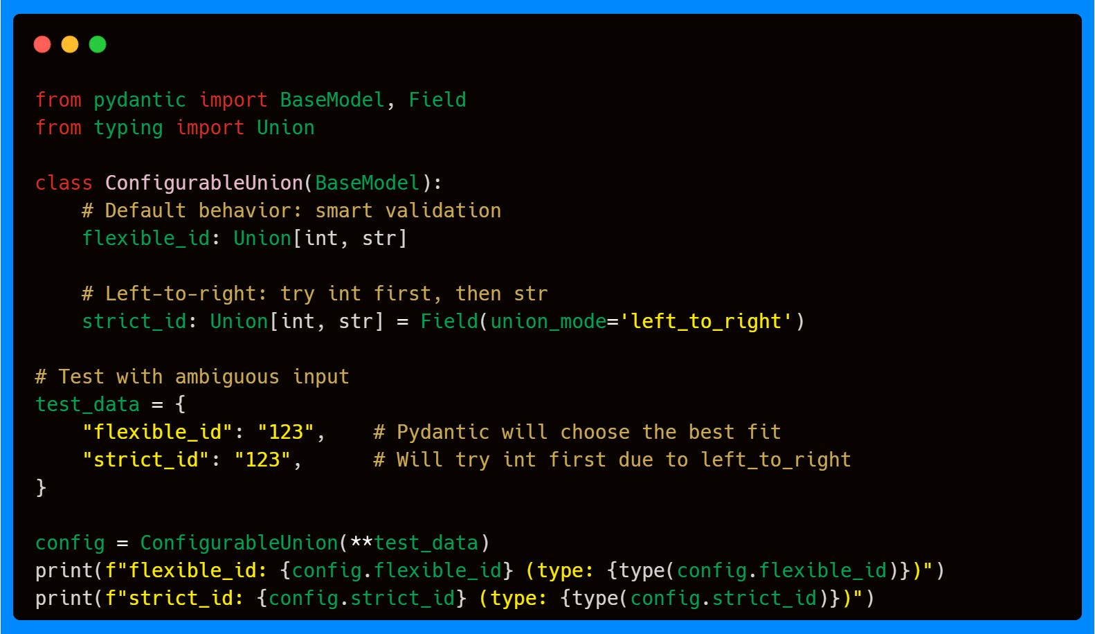 Here, the same string "123" could fit both int and str. In default smart mode, Pydantic keeps it as a str because it matches naturally without coercion. In left_to_right mode, Pydantic tries the first type (int) and succeeds by coercing the string into an integer. This gives you more control over how ambiguous data should be resolved.