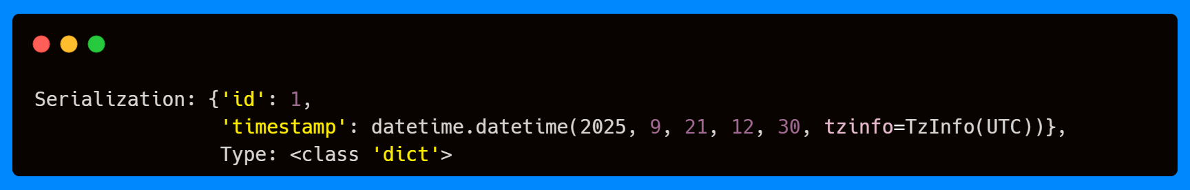 Note that we add the ConfigDict arbitrary_types_allowed parameter as NumPy arrays don't have built-in Pydantic support. Here, NumPy arrays are converted into Python lists and datetimes into timestamps. The serializer functions completely replace Pydantic’s default serialization for those fields.