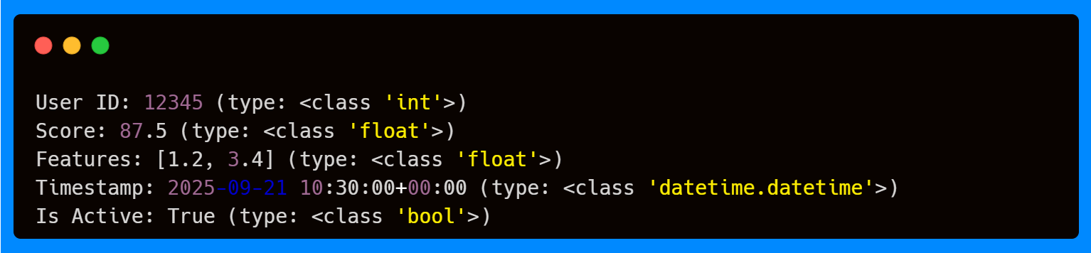 Beyond the standard types like integers, floats, lists, or strings, Pydantic includes custom types for common use cases in application development, many of which are particularly useful in ML/AI contexts. I’ll cover a few of them here—the list is extensive—but you can explore the complete set in the official docs.
