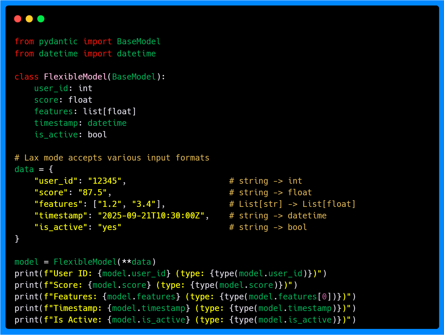By default, Pydantic uses lax mode, which attempts reasonable type conversions to transform compatible inputs into the expected types. This flexibility is invaluable when working with data from external sources like CSVs or user inputs, where types might not perfectly match your model definitions.