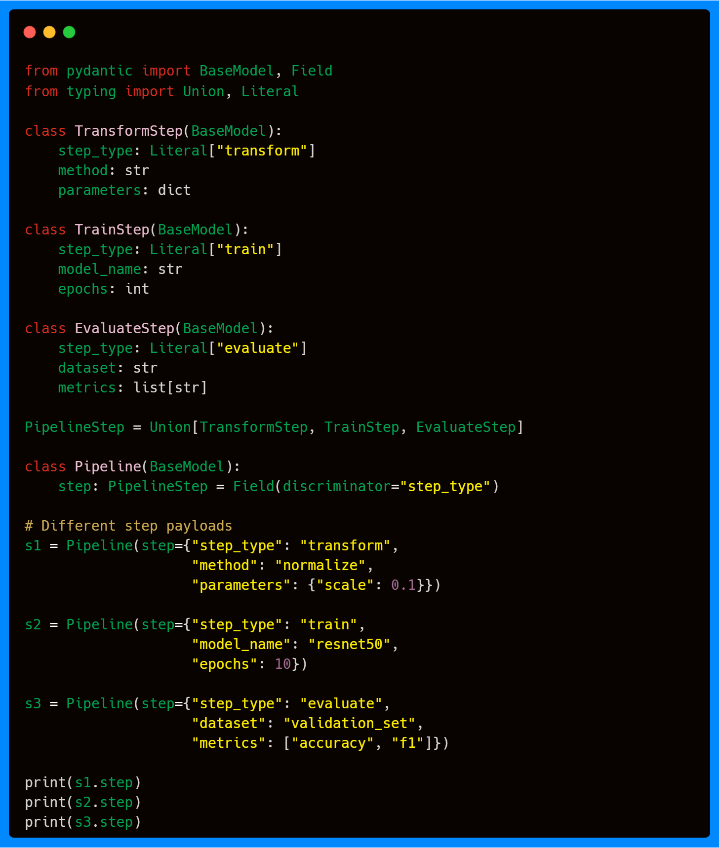 Here, the step_type field acts as the discriminator. Depending on whether it’s "transform", "train", or "evaluate", Pydantic will instantiate the correct model. This avoids guesswork and makes validation strict while still supporting multiple shapes under one field. When possible, it’s best to rely on discriminated unions, as they provide both speed and more predictable validation results.