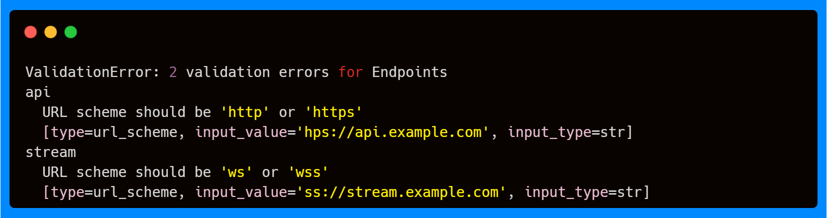 Malformed DSNs are caught immediately, and Pydantic provides a detailed error message with the formats that can be accepted.