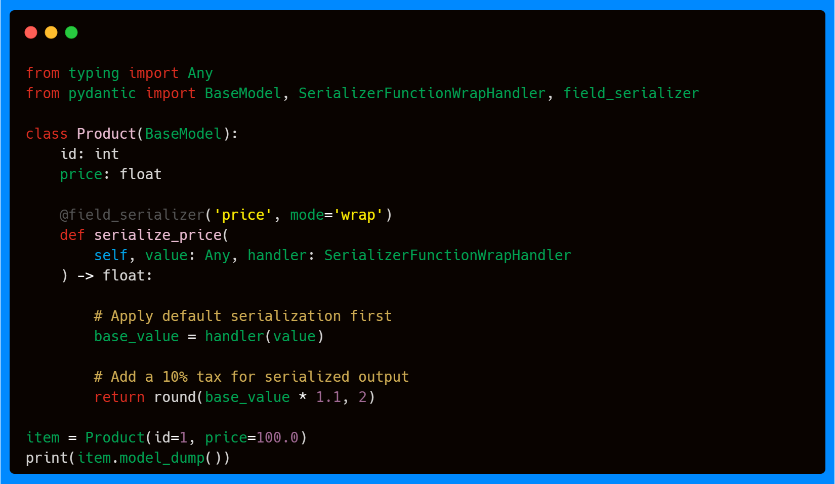 Here, the wrap handler ensures that the price value is processed through Pydantic’s default serialization before applying a custom transformation (adding tax). This makes it easy to extend behavior rather than replacing it outright.