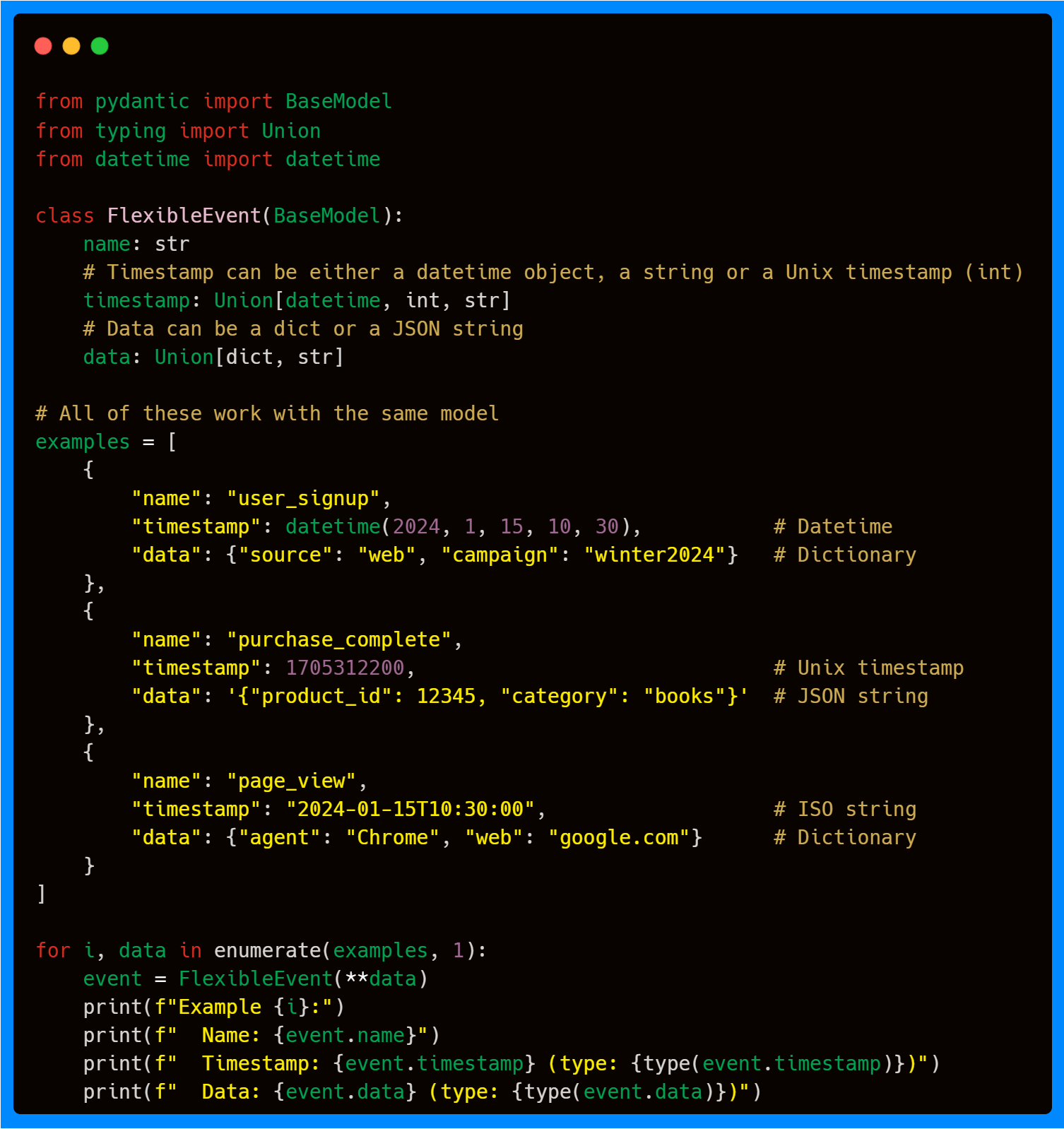 Finally, let’s look at how Pydantic handles situations where data can take multiple valid forms—unions.