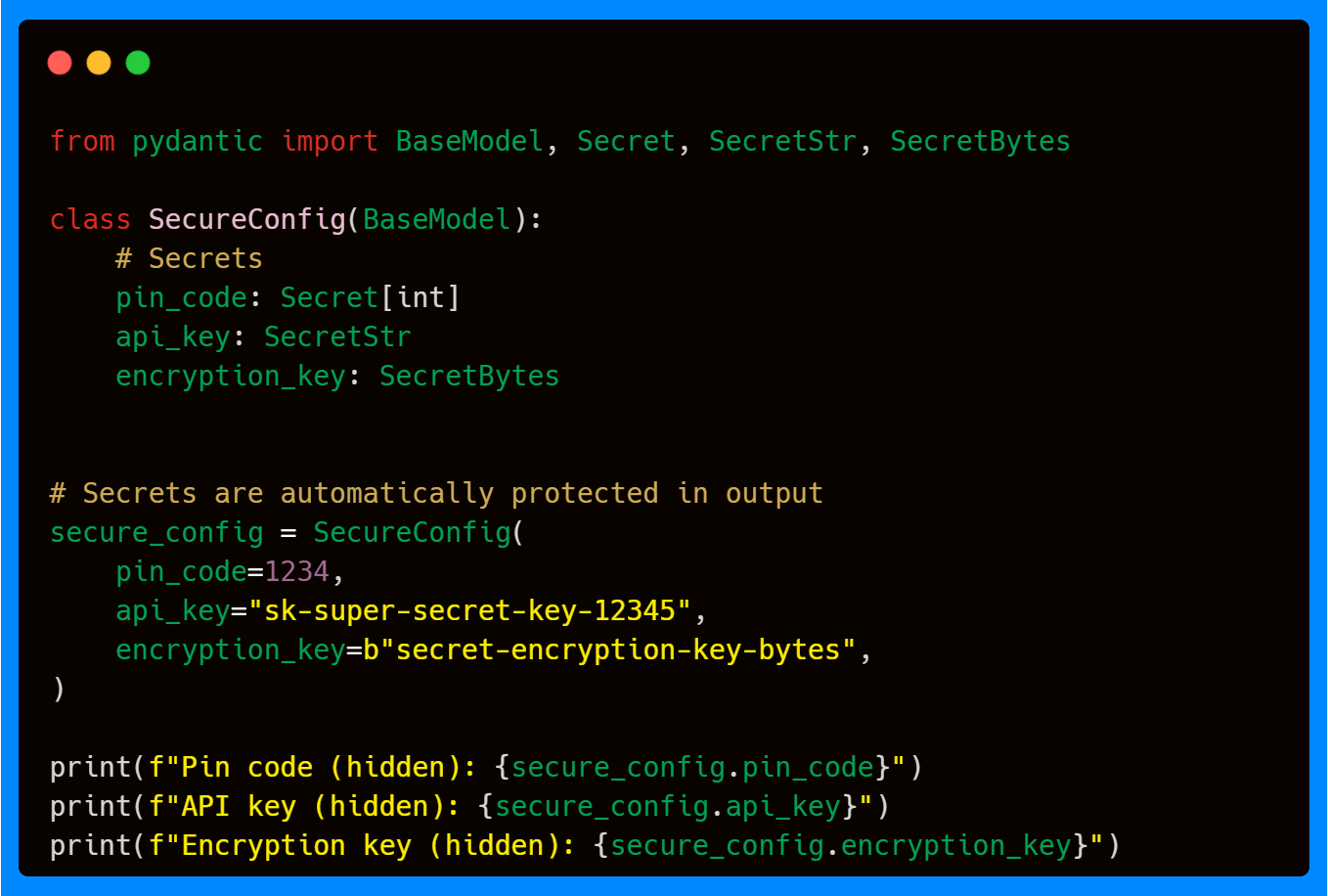 When dealing with API keys, database passwords, or PINs, one of the biggest risks is accidentally leaking them in logs or error traces. Pydantic provides three secret types: