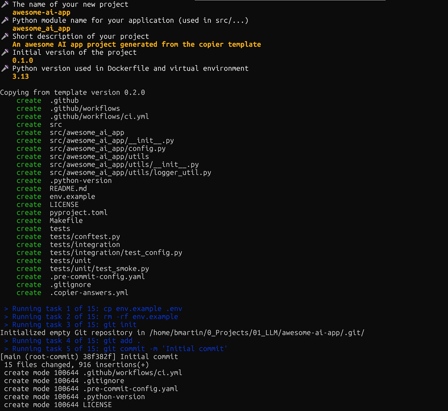 default: “3.13”The _tasks section is where Copier shows its power. These aren’t just file generation steps—they’re actual commands that run after your project is created. The template doesn’t just create a git repository; it initializes it, makes the first commit, and pushes it to GitHub. It doesn’t just write a pyproject.toml; it installs all dependencies and runs your test suite.